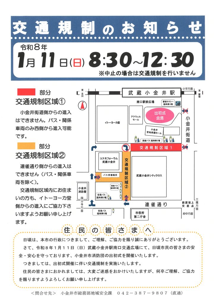 【お知らせ】小金井市消防団 出初式 交通規制のお知らせ