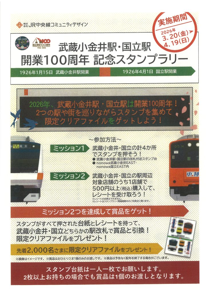スタンプがすべて押された台紙とレシートを持って、武蔵小金井・国立のどちらかの駅改札で商品と引換!限定クリアファイルをプレゼント!