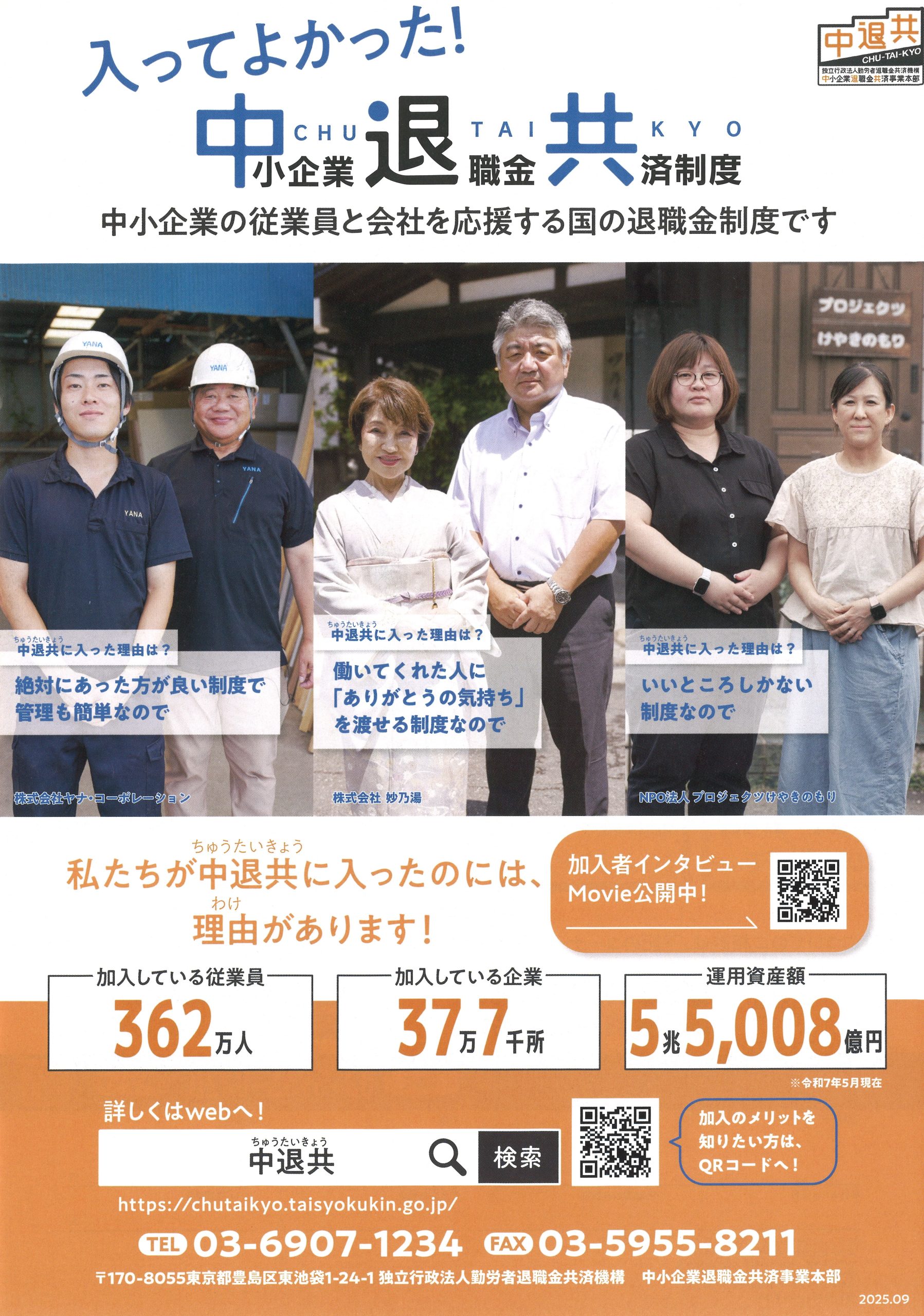 入ってよかった! 中小企業退職金共済制度 中小企業の従業員と会社を応援する国の退職金制度です 詳しくはwebへ! https://chutaikyo.taisyokukin.go.jp/ TE...