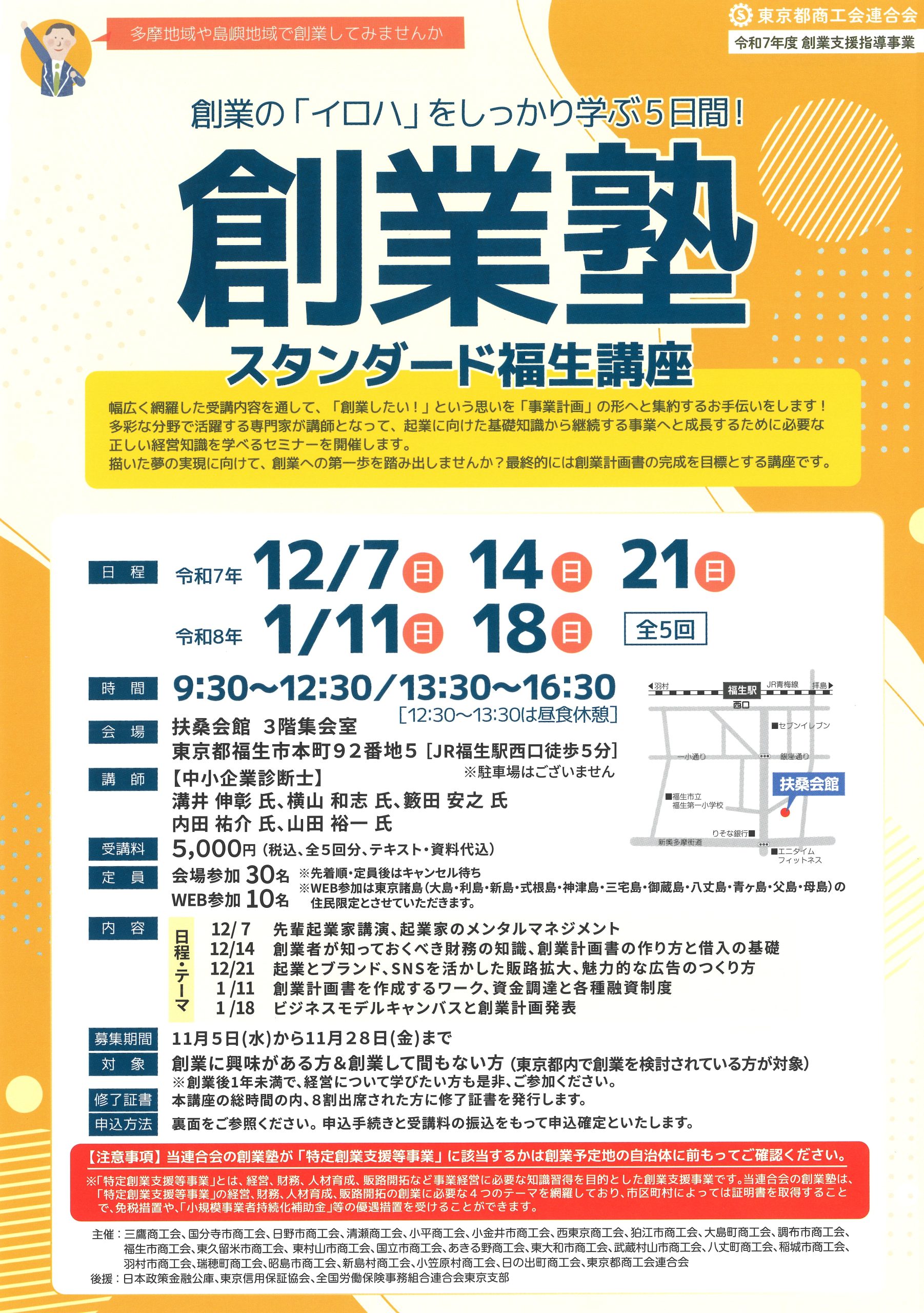 多摩地域や島嶼地域で創業してみませんか 東京都商工会連合会 令和7年度 創業支援指導事業 創業の「イロハ」をしっかり学ぶ5日間! 創業塾 スタンダード福生講座 幅広く網羅した受講内容を通して、「...